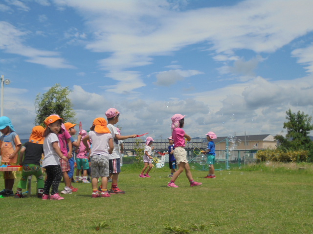 お天気の日にはグラウンドでしゃぼん玉遊びをしています。