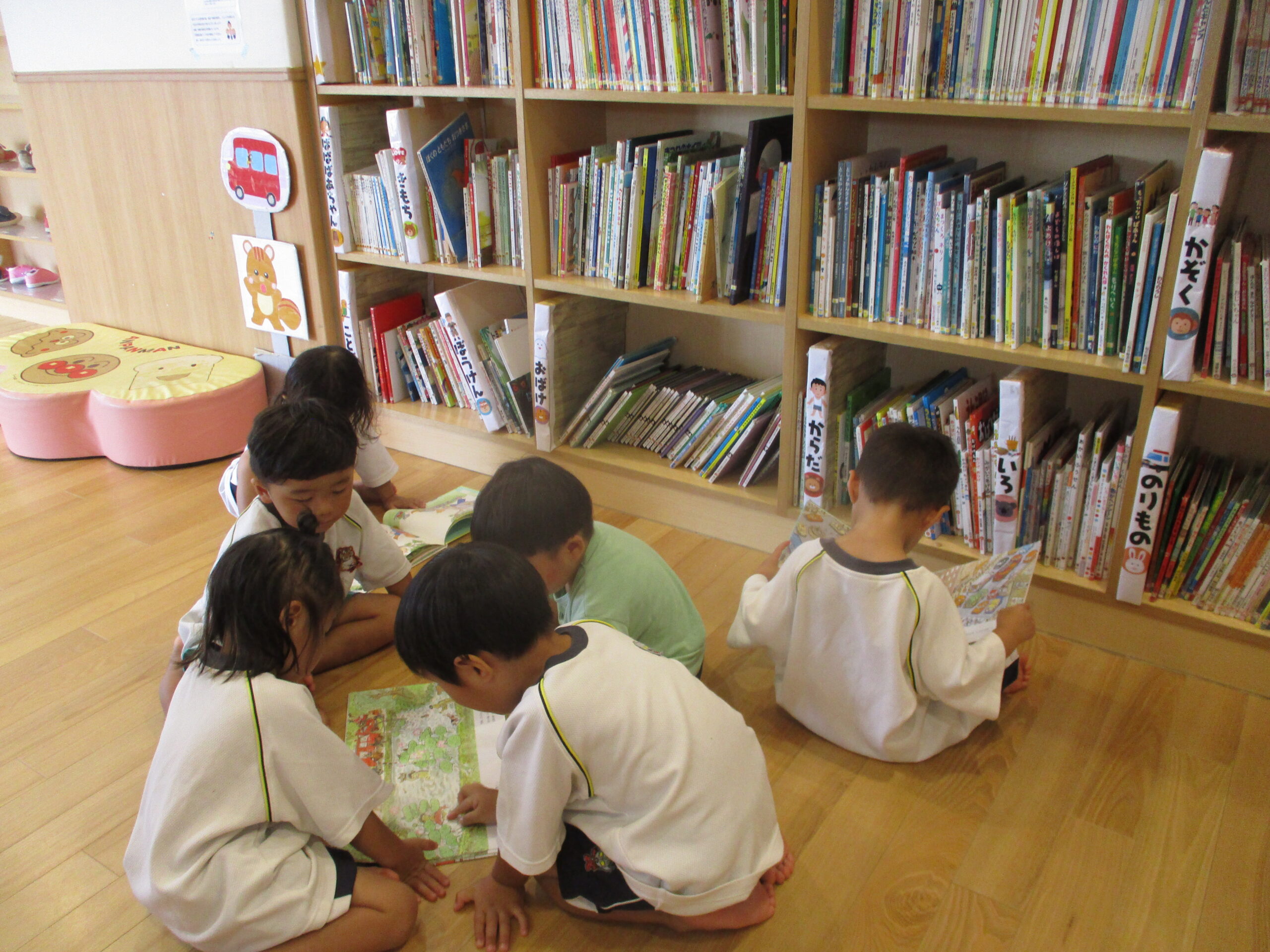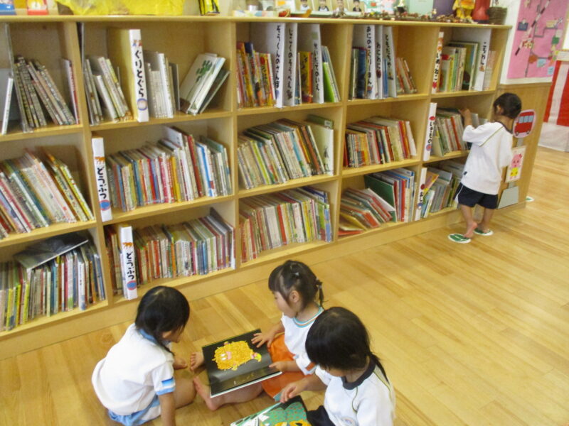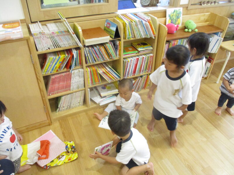 園にはたくさんの絵本があり、全年齢クラスがいつでも見に来ています!
