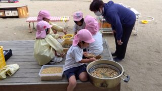 お知らせ大豆の収穫 保育園にある畑で大豆を収穫しました。その殻むきを5歳児の子ども達が手伝ってくれました!「うわぁ、おまめのいろが変わってる~」「おまめ、かちかちやなぁ」と豆の変化に気づき「この、おまめどうするの~?」と給食の先生に質問すると・・「お味噌と豆腐...2024.12.11お知らせ園の様子未分類
